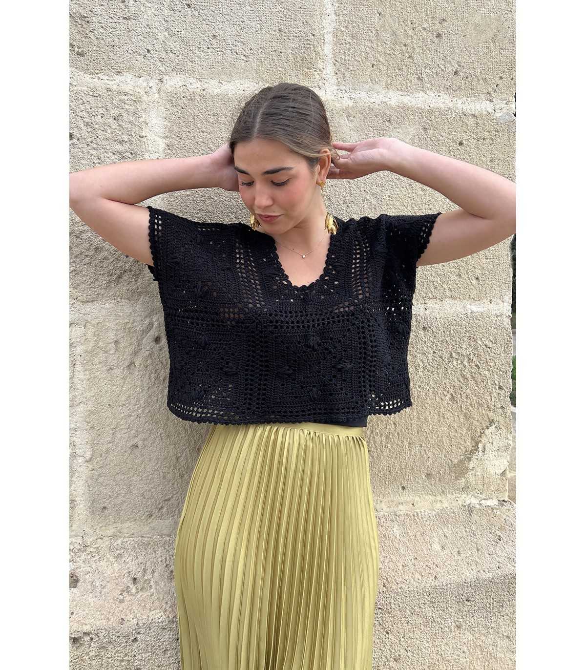 Es un diseño oversize fluido, que sin ajustarse al cuerpo, tiene un toque romántico con sus calados y flores.